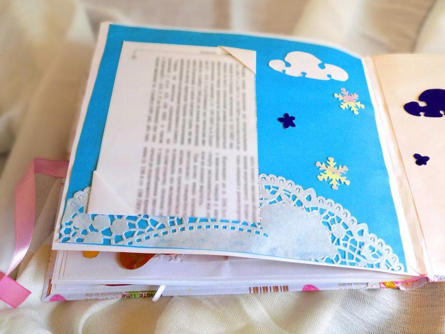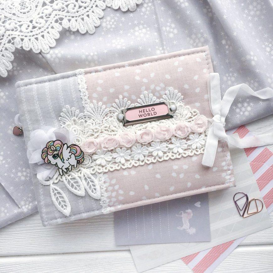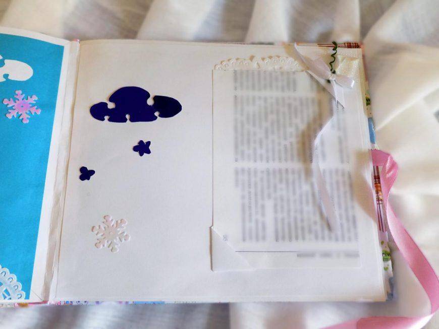 Следующий шаг – украшение обложки стразами. Их можно разместить на ткани, на цветах и даже на кружеве. Главное, чтобы такой декор смотрелся гармонично и детский альбом не превратился в атрибут гламурной леди.