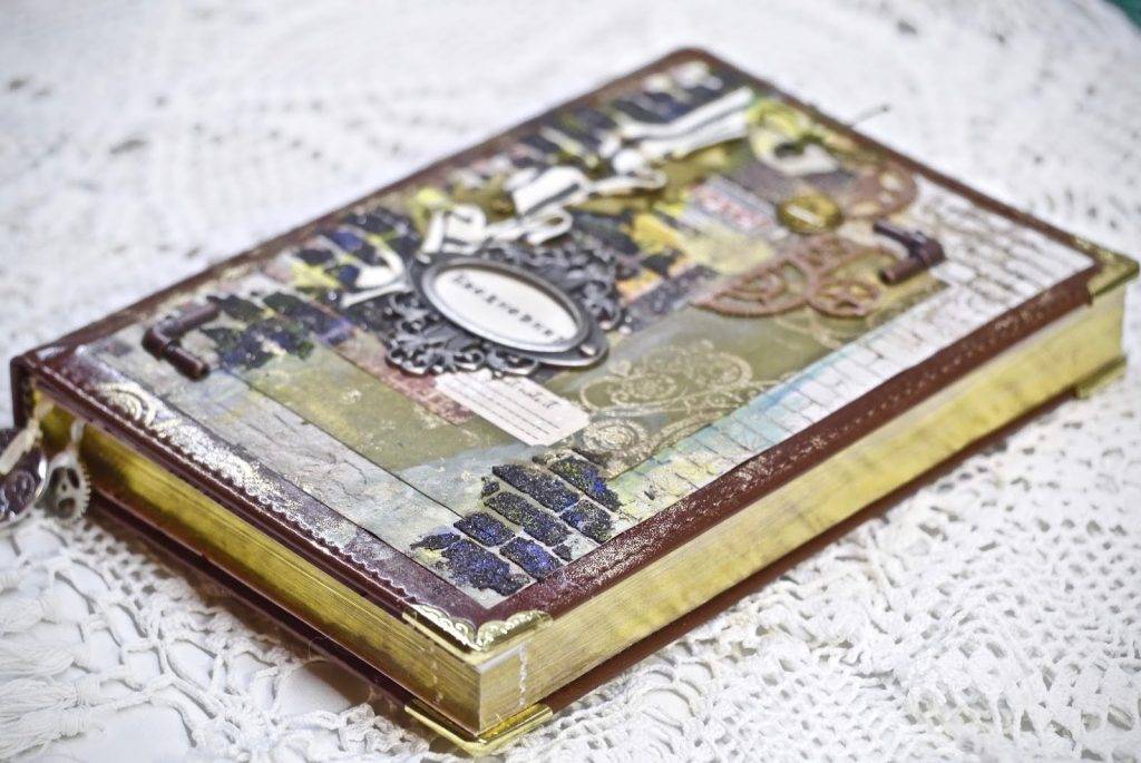 Изнутри вклей тонкие ленты-завязки и задекорируй лицевую сторону заготовками. Используй картинки, цветы, лепестки, объемные детали, специальный декор для скрапбукинга. Приклей сверху шестеренки, ключики, замочки, маленькие подвески, бусины или любые другие украшения.
