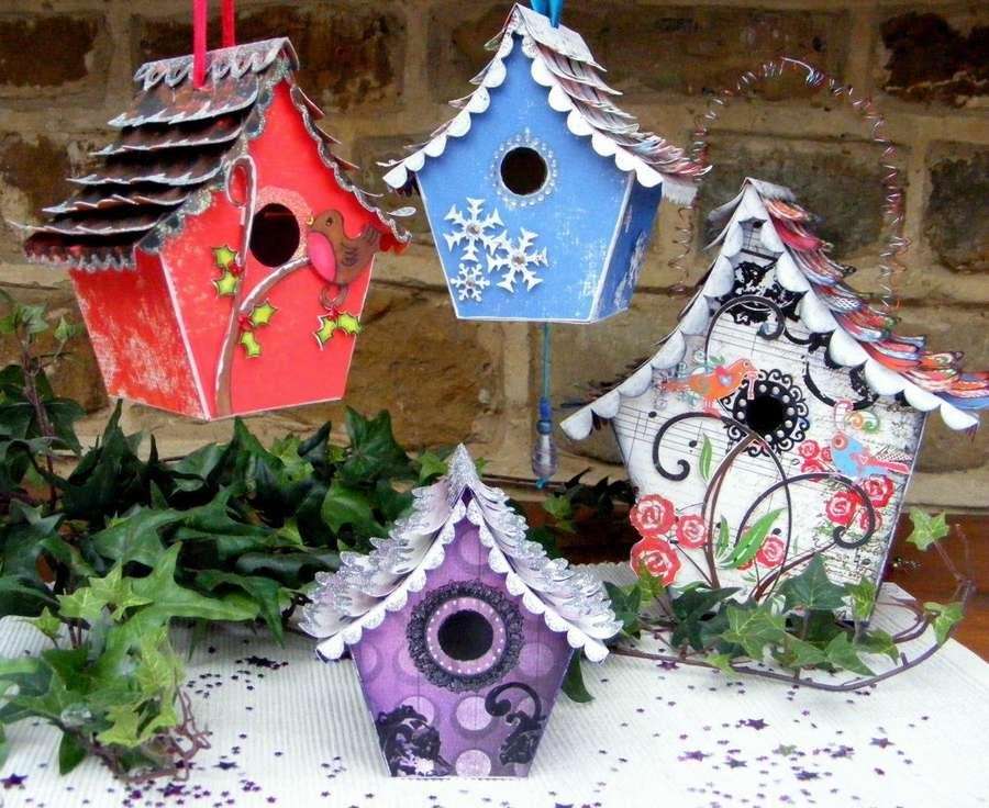 Если использовать цветной картон необычной расцветки, то и скворечники из него получатся очень необычные. Например, такие, как ниже. А еще декорировать их можно ярким цветком на коньке крыше.