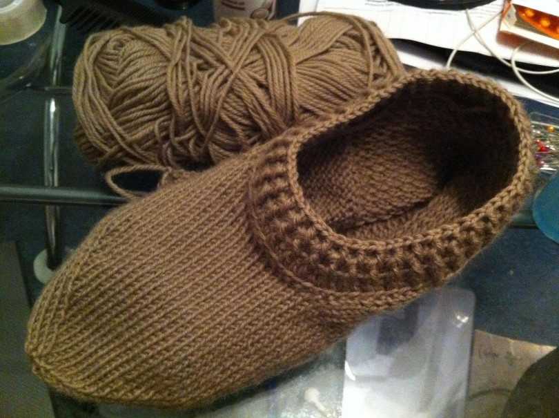 Тапочки вяжутся очень быстро. Резинкой 2 на 2 вяжут боковые стороны и подошву.