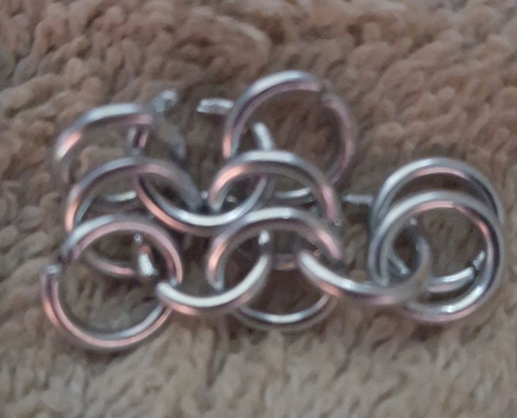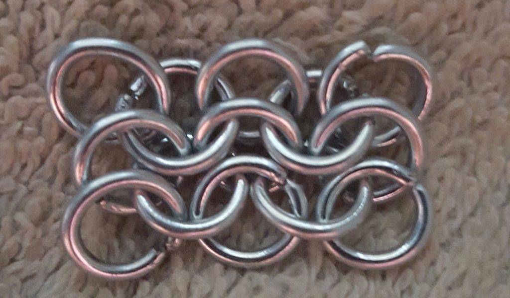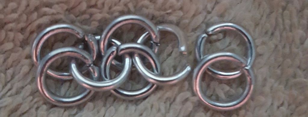 Выберите способ плетения из представленных, при помощи него соединяйте колечки в полотно. Вот как сделать кольчугу, используя схему плетения методом «элементарных ячеек». Для этого возьмите 4 кольца, проденьте в них одно пока еще не сомкнутое кольцо. Соедините его концы, расправьте, чтобы получилась заготовка из 5 колечек.