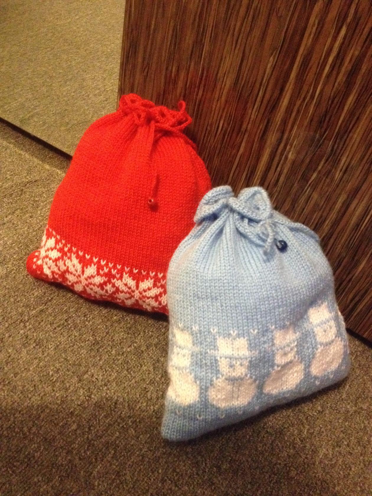 Свяжите крючком шнурок – наберите цепочку воздушных петель и вернитесь по ней, выполняя столбики без накида. Шнурок протяните сквозь полотно горловины. Остальные мешочки также свяжите на спицах. Декоративные элементы для них свяжите крючком и нашейте сверху.