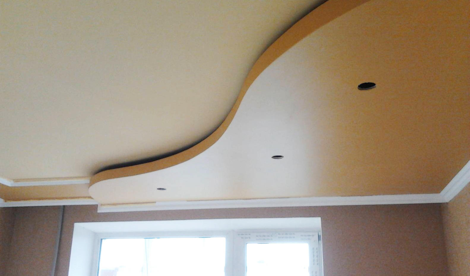 - Конструкция фигурного типа – предусматривает использование гипсокартона. В некоторых моделях встречается включение элементов ПВХ. Настоятельно рекомендуется перед началом работы выполнить правильную разметку, иначе придется все переделывать.