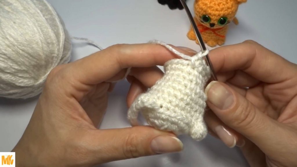 - От спины вяжем вниз, образуя животик, заднюю ногу и в конце вяжем передние лапки.
