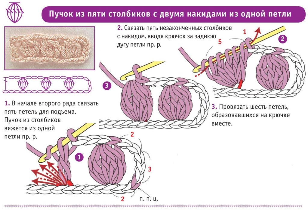 - Один ст. без накида в каждый из четырех ст. без накида. Один соединительный столбик в последний ст. без накида.