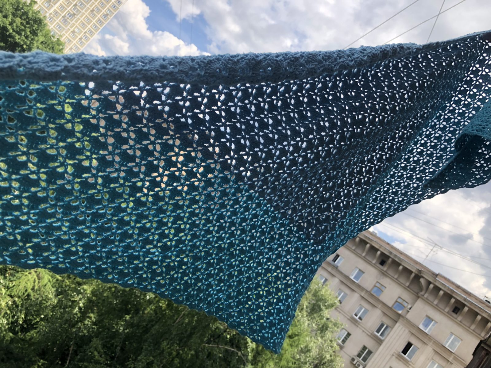 Данное изделие идеально на размер одежды 42-44. Длины хватит на то, чтобы повязать бактус на голову, укутать плечи или носить как шарф. Размах крыльев — 150 см, ширина — 65 см. 75 рядов.