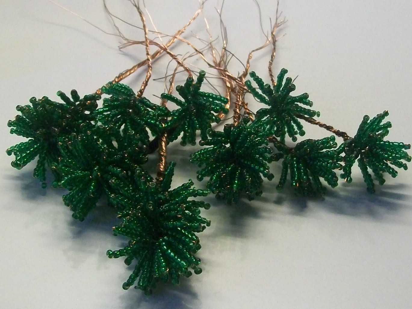 - бисер зеленого цвета (более реалистично будут смотреться темно-зеленые оттенки, но для создания объема в процесс изготовления лучше добавить все доступные вариации стекляруса зеленого цвета и использовать их на небольшом количестве веток в разных местах сосны);