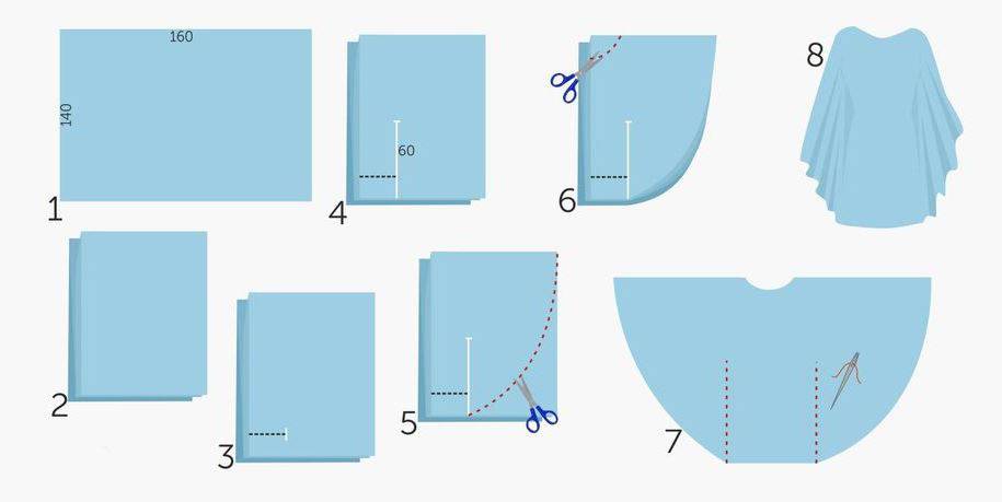 - Самостоятельно выбираем, какой формы будет вырез для головы. Это не принципиально: широкий разрез делает наряд более интересным, его можно носить, спуская с плеч или сделать вырез под декольте, узкие разрез выглядит более строго и сдержано.