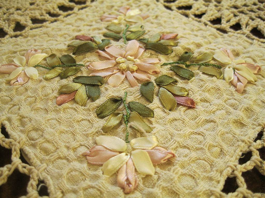 Что ж, вот и все. Цветок из ленты – самая простая в исполнении работа, которая хорошо смотрится на той же скатерти, или же подушке и салфетке. Надеемся наши фото натолкнут вас на много новых идей в этом ключе.