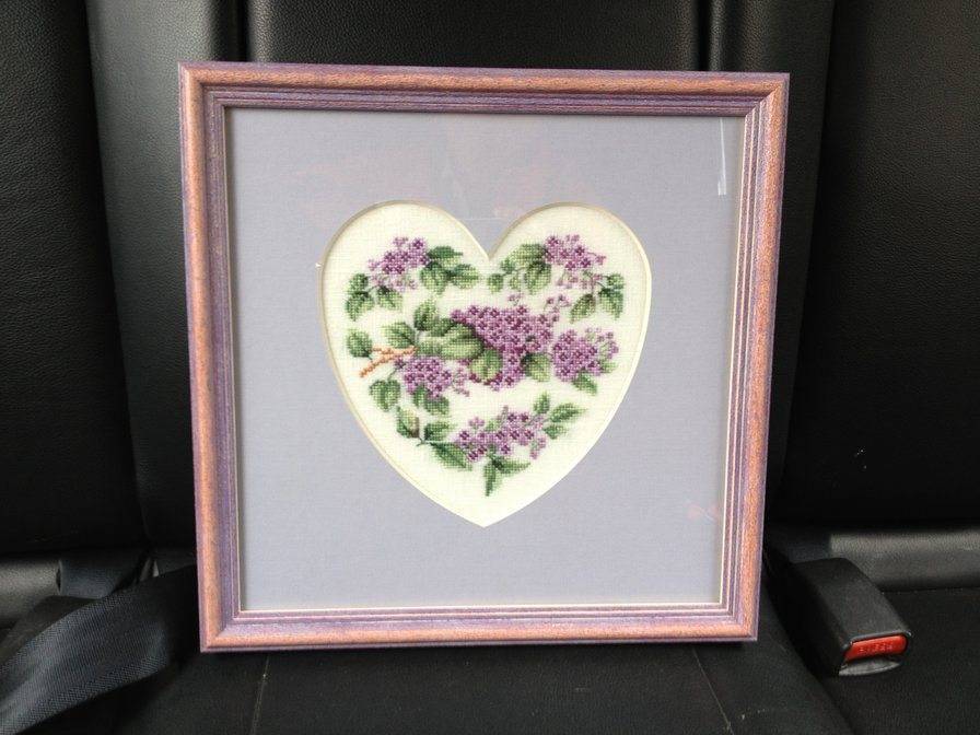 Прошьем ткань по форме трех веток с цветками, которые скрещиваются под небольшим углом. Это будет основой. Далее, используя гобеленовую иглу и ленту сиреневого цвета, будем делать стежки по технике «французский узелок на ножке». Должен получиться один из цветков – средний. Два других можно сделать из лент темно-фиолетового цвета. Стебелек же нужно делать из зеленой нити для вязания, прокладывая ее большими стежками. Последним элементом будут листики из широкой темно-зеленой ленты. Можно добавить изящный бантик в том месте, где стебли пересекаются.