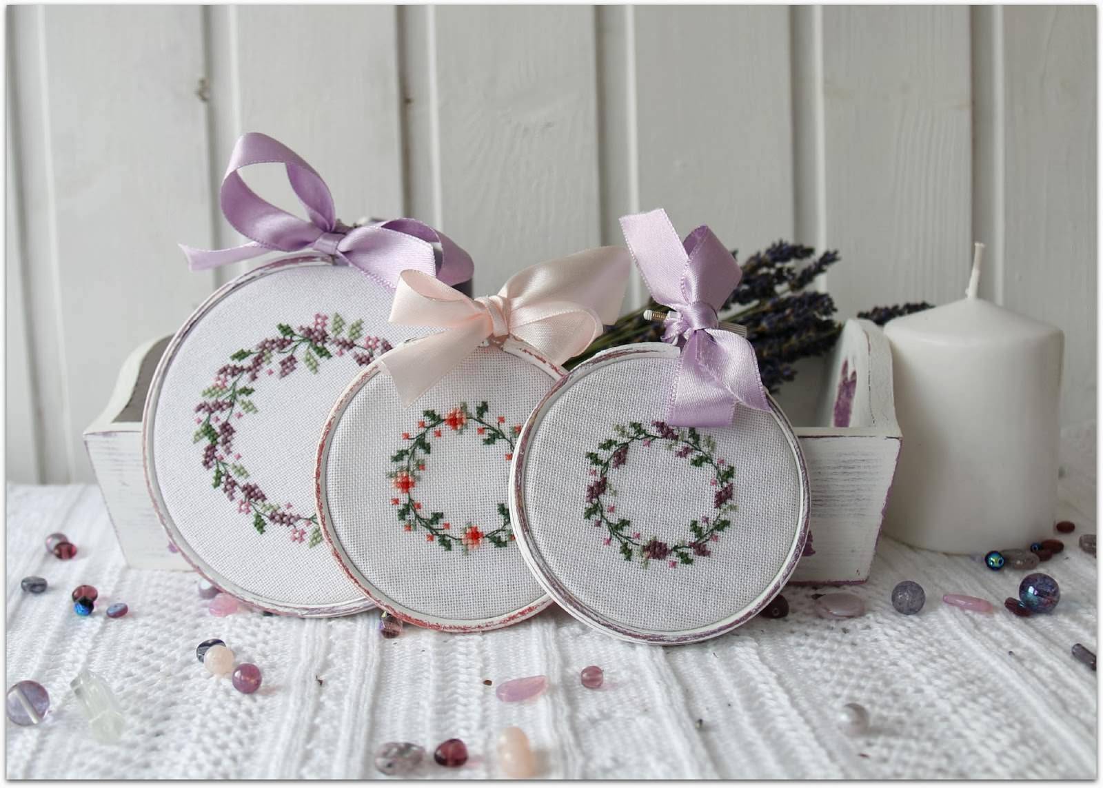 Для выполнения работы используются только натуральные материалы: хлопок, лён, бязь. Прованс объединяет вышивание крестиком, атласными лентами и неотразимым ришелье.