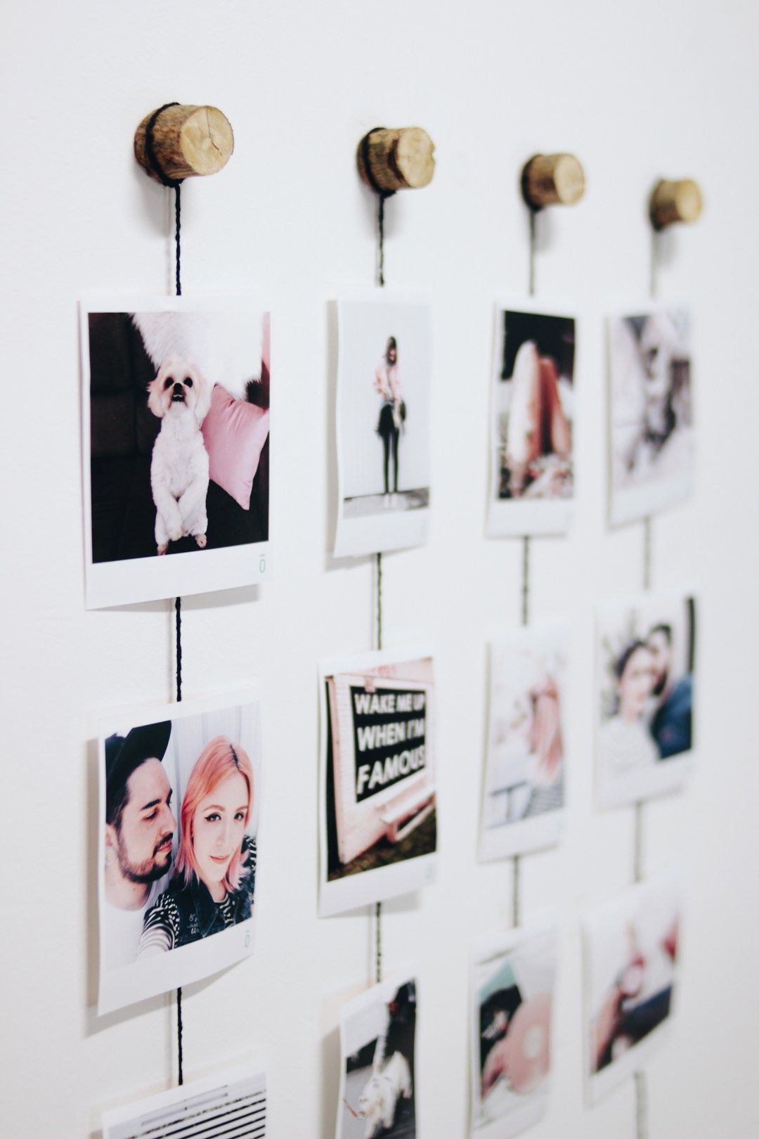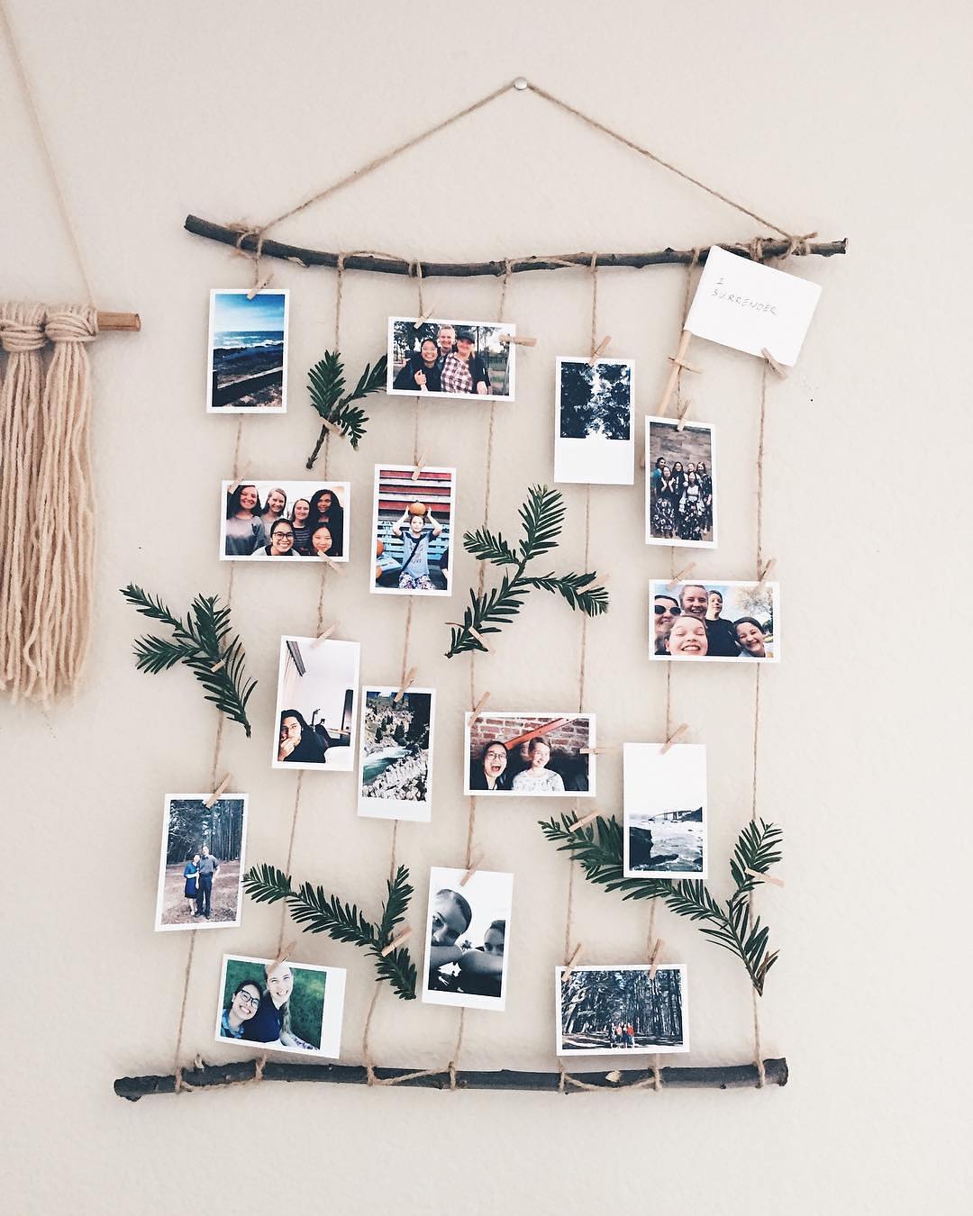 Постепенно насаживаете на нитку фотографии и закрепляете узелками, чтобы они не падали.
