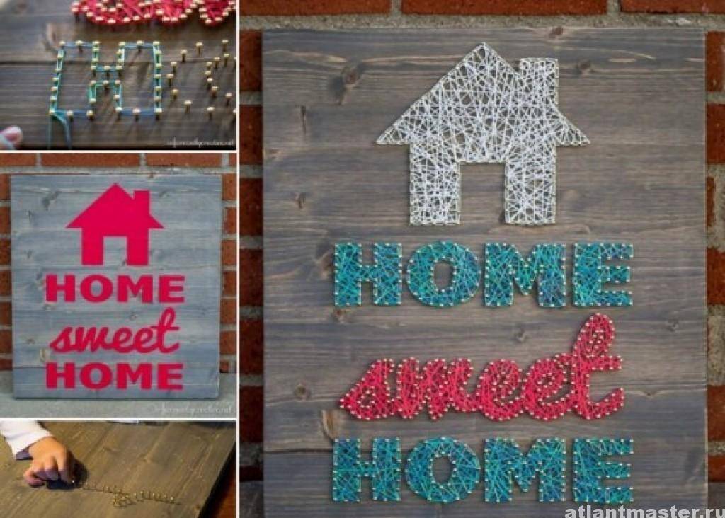 Буквенный дизайн — давно известный интерьерный тренд, его привнесли западные дизайнеры. Буквы, слова, словосочетания — все эти элементы достаточно уместны в декоре, а в сочетании с нитями и гвоздями они превращаются в стильные объемные украшения для дома.