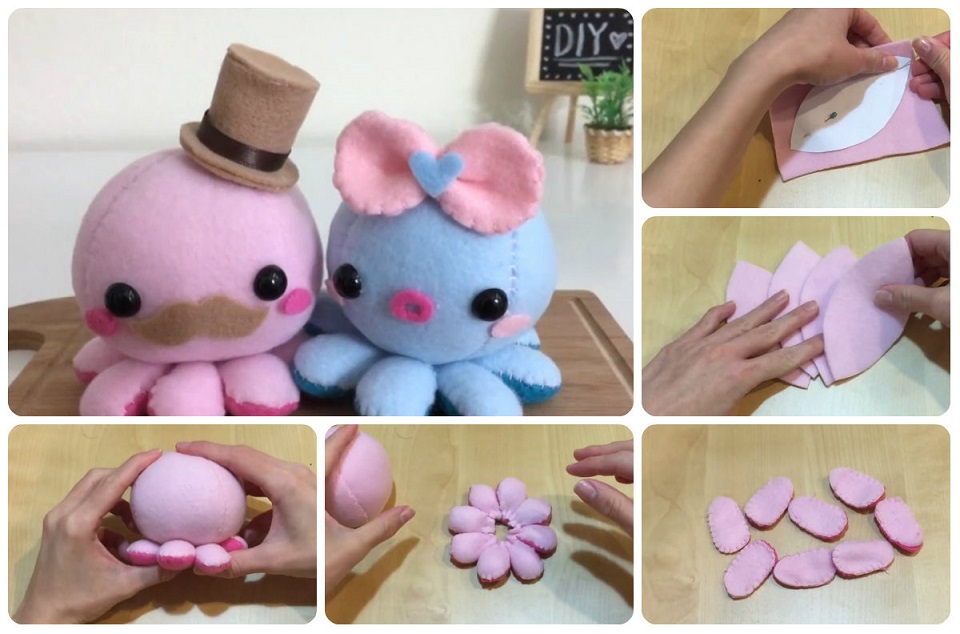 Сначала подготовьте все необходимое для создания игрушки: розовый фетр, пуговицы для глаз, материал для головного убора и усов, маленькую ленточку для шляпы. Начать стоит с глазок. Просто приклейте их к туловищу. Затем вырежьте из розового фетра два маленьких овала. Это щечки осьминога. Из коричневого фетра нужно вырезать усы. Все эти детали прикрепите к туловищу клеем.