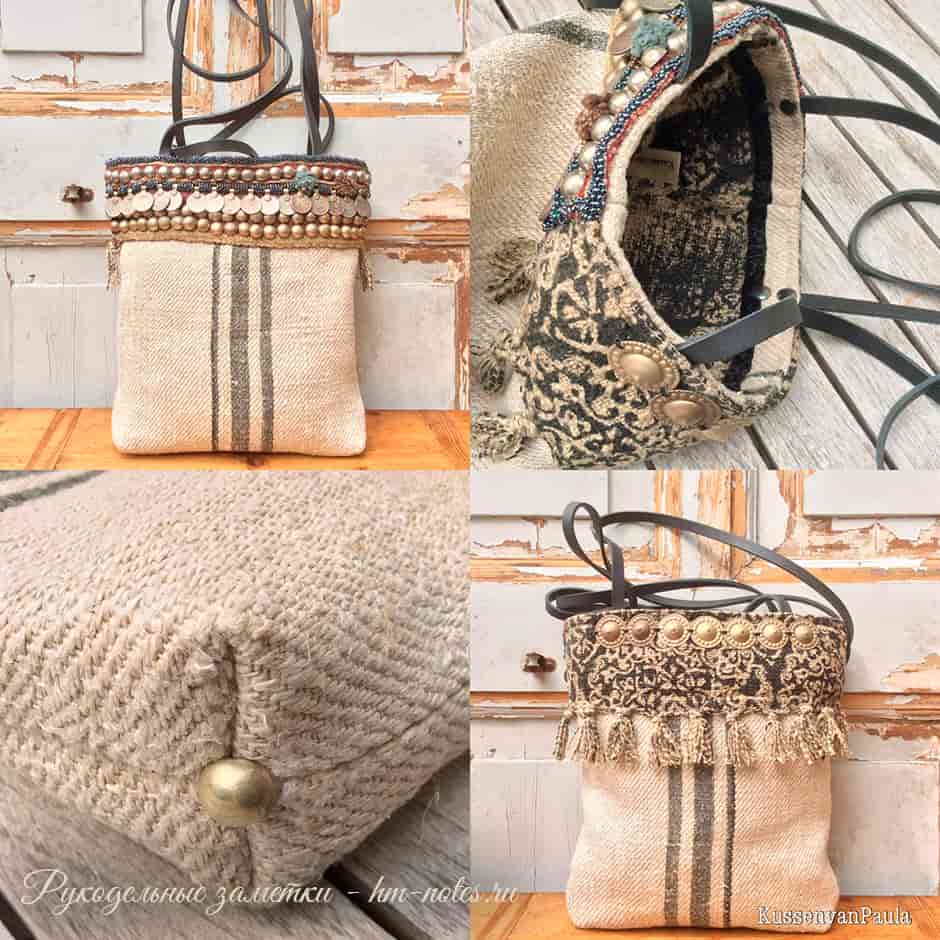С бежево-коричневой гаммой мешковины великолепно сочетаются этнические орнаменты и винтажные элементы. Эффектные сумочки украшенные таким способом всегда выделяются на общем фоне.