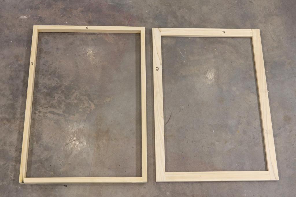 Соедините одну деталь Б с двумя деталями А при помощи столярного клея и саморезов. Промажьте клеем торцы перекладин и вставьте их в заготовленные пазы. Проверьте правильность соединения каркаса при помощи строительного уголка, выверив прямой угол. Дайте этой заготовке высохнуть. Сверху закрепите перекладины во вторую деталь Б, а ее саму соедините с деталями А также при помощи клея и саморезов.