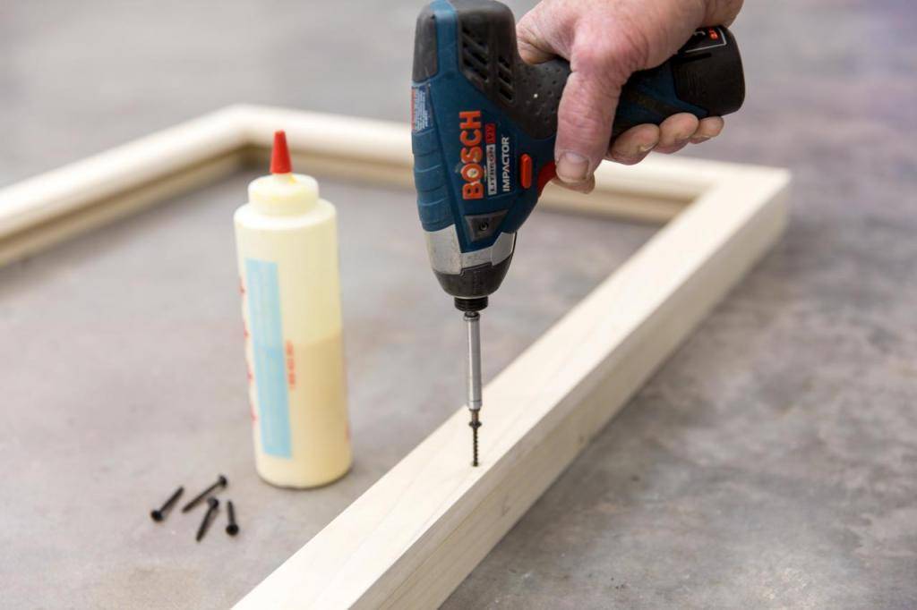 Готовые рамки наложите одна на другую, чтобы внешние периметры совпали. Промажьте стыкуемые поверхности клеем и соедините их саморезами, начиная вкручивать их со стороны более широкой рамки. Так шляпки саморезов окажутся на изнаночной стороне сушилки. Дайте клею полностью просохнуть по инструкции к нему.