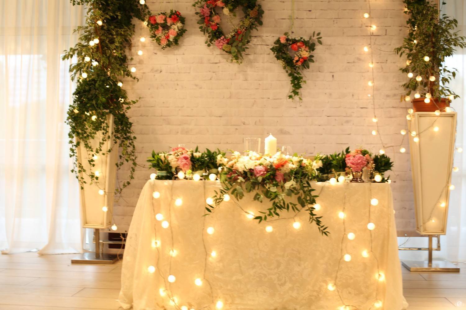 При этом цветочное оформление должно гармонично сочетаться с тканевым. Если выбран яркий, объемный и необычный способ драпировки, то не стоит использоваться слишком объемные цветочные композиции, особенно со свисающей наподобие плюща зеленью или цветами. Если же стол украшен юбочкой с классической волной, то акцент должен быть сделан как раз на цветочном декоре.