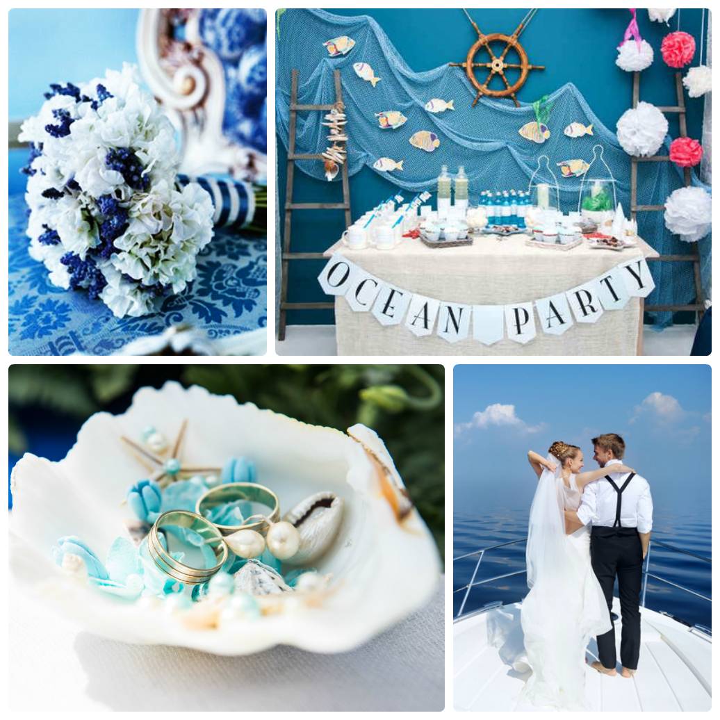 Тяжелее всего заниматься организацией свадебного банкета. Прежде чем начать работу, необходимо подобрать подходящую тематику. Если молодожены выбрали морской стиль, то рекомендуется использовать ракушки, аквариумы, рыбок. Цветовая гамма — синий, голубой и бежевый. Можно обернуть тканью таких цветов стулья и столы. Стены и потолки завешивают белой хлопчатобумажной тканью. Стол молодоженов напоминает спасательный круг.