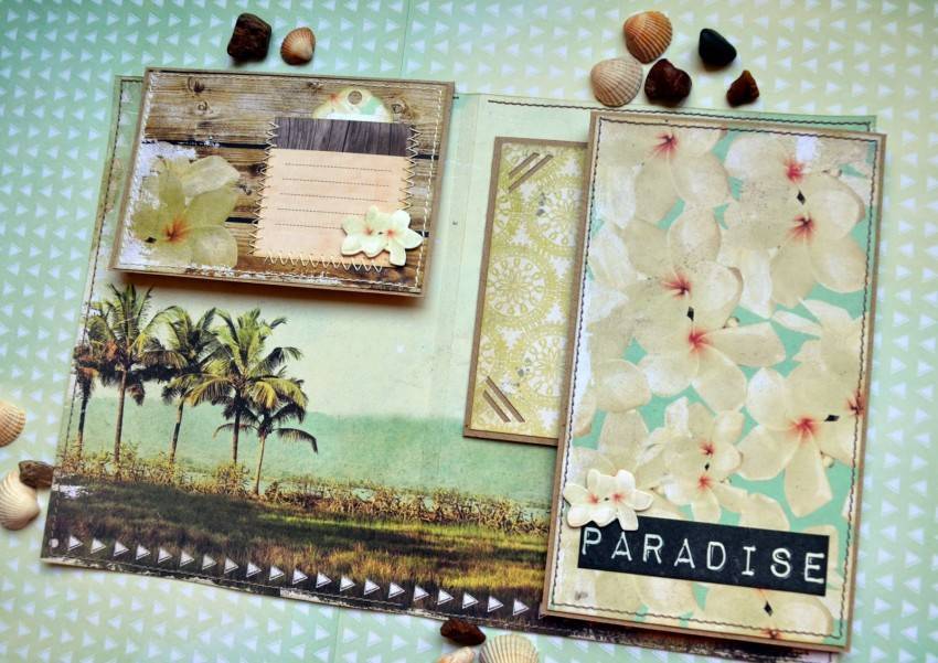 Немаловажным значением обладает правильная композиция. В идеальном случае на странице присутствуют мелкие, крупные, средние элементы. Вместе они создают гармоничную картину, на которую приятно смотреть. Поместите сначала снимки на страницу, разные элементы, пробуйте передвигать их, пока результат вас не удовлетворит. Пользуйтесь горизонтальной, вертикальной раскладкой, под углом, по кругу, спирали и т.д., чтобы добавить движения. Основные цвета композиции должны повторяться в декоративных элементах.