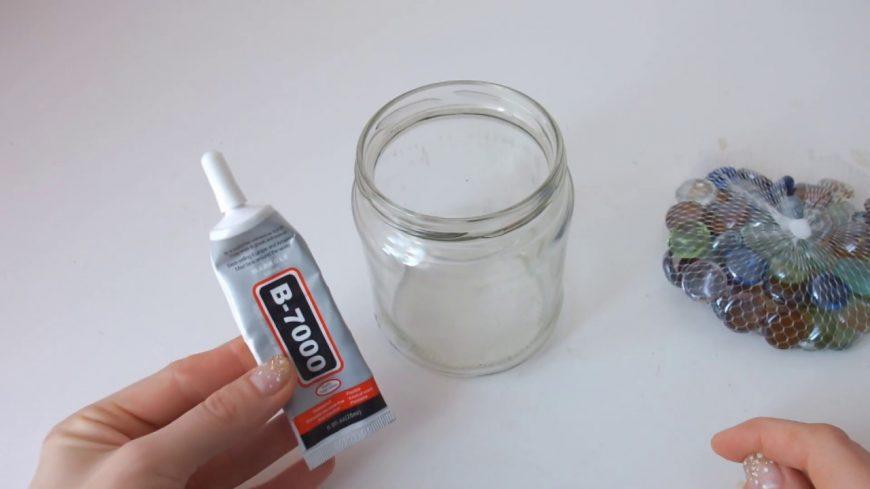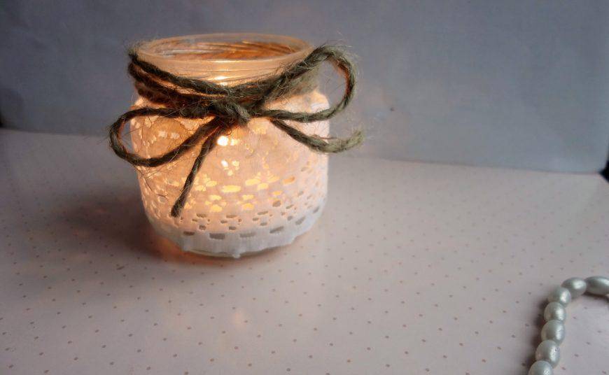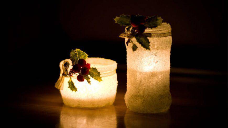 Литровая, пол-литровая баночка или тара от майонеза – отличный выбор для творчества. Ёмкости красят, оставляя узорные оконца, обтягивают кружевом, мешковиной, толстыми верёвками, наряжают в вязаную «одёжку». При прозрачном варианте внутренность заполняется хвоей, посыпанной снегом-солью. В оснащённый сугроб водружается свечка. Для декорации пригодятся красочные ягодки, цветная пряжа, милые побрякушки.