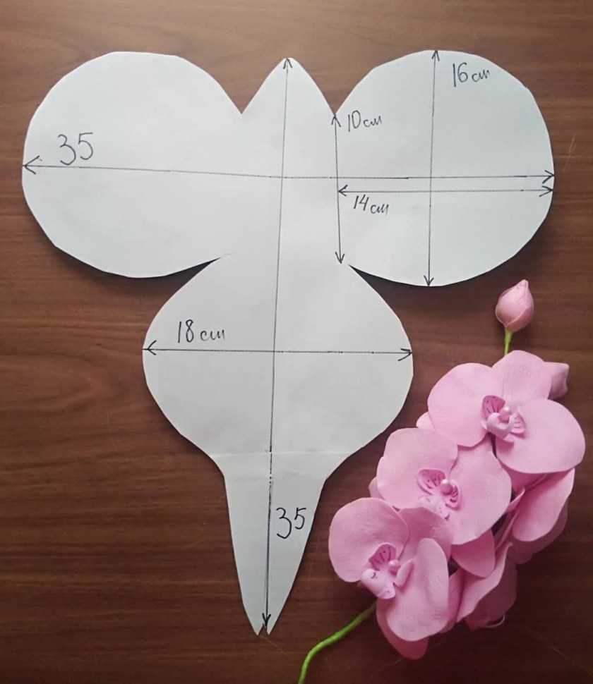 Невероятно красивой, нежной и женственной получается орхидея, выполненная именно из этого материала. Этот цветок не требует большого количества лепестков, но его нужно сделать максимально естественным с помощью разукрашивания акриловыми красками. Схема лепестков — самая простая. Ее можно вырезать любого размера.