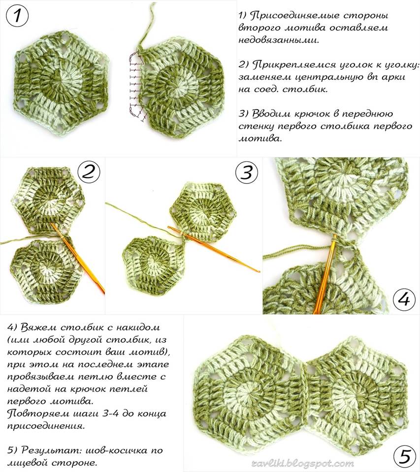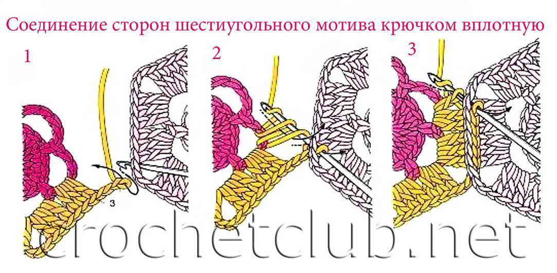 Еще один способ — связать дополнительный ряд из воздушных петель и столбиков без накида. Для этого в уголке одного фрагмента связать 1 столбик без накида, потом связать столбик в углу другого фрагмента. После 3 воздушной петли завести крючок под воздушные петли обоих шестиугольников и провязать столбик без накида. Связанный таким образом шов получается плоским и не жестким. Для этого способа сшивания мотивов можно использовать нить другого цвета. Это выделит фрагменты на общем фоне, как рамка.