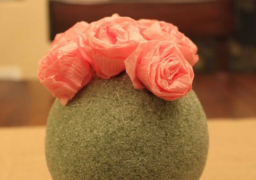 Получившиеся цветы с помощью горячего клея «садим» на пенопластовый шар, предварительно обклеенный зелёной бумагой.