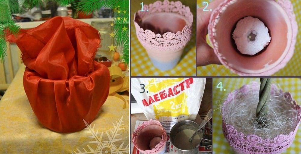До заливки топиария гипсом приклеиваем на горшок кружево, по кромке. Также не забудьте тщательно заклеить дренажное отверстие, если используется цветочное кашпо.