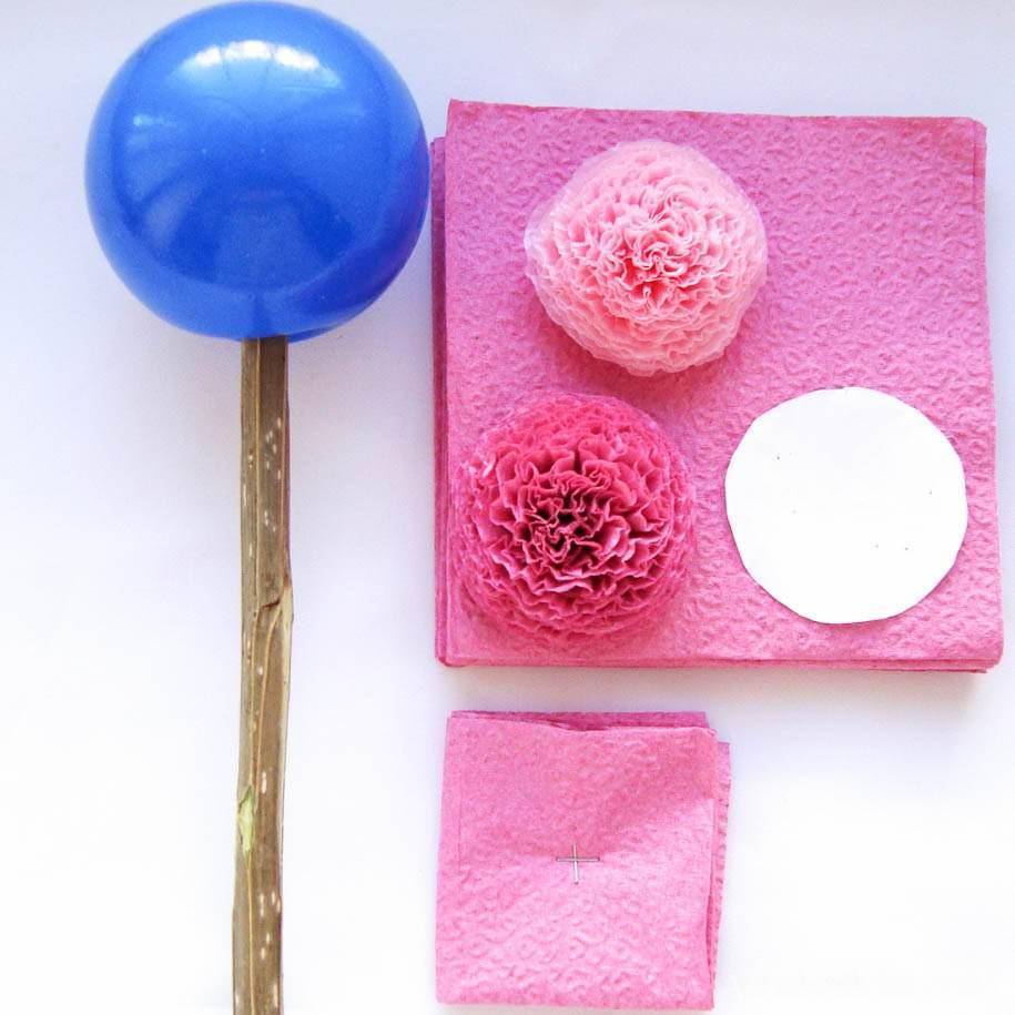 - Ну а теперь МК предполагает создание кроны. Шар нужно обклеить цветами из салфеток, между бутонами не должно быть никаких промежутков. Замечательно, если своими руками вы выкрасите шар в цвет бутонов, чтобы даже мелкий зазор был хорошенько замаскирован.