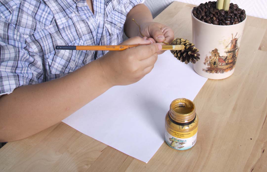 - Шишки отсортировать, помыть, высушить и покрасить водно-дисперсионной краской. После высыхания, украсить шишки золотистым блеском.