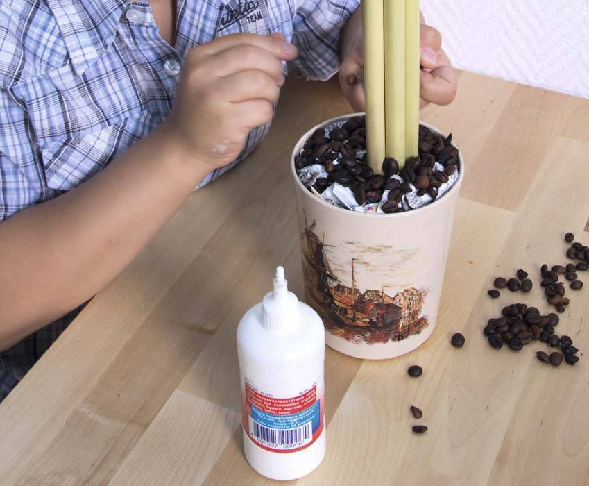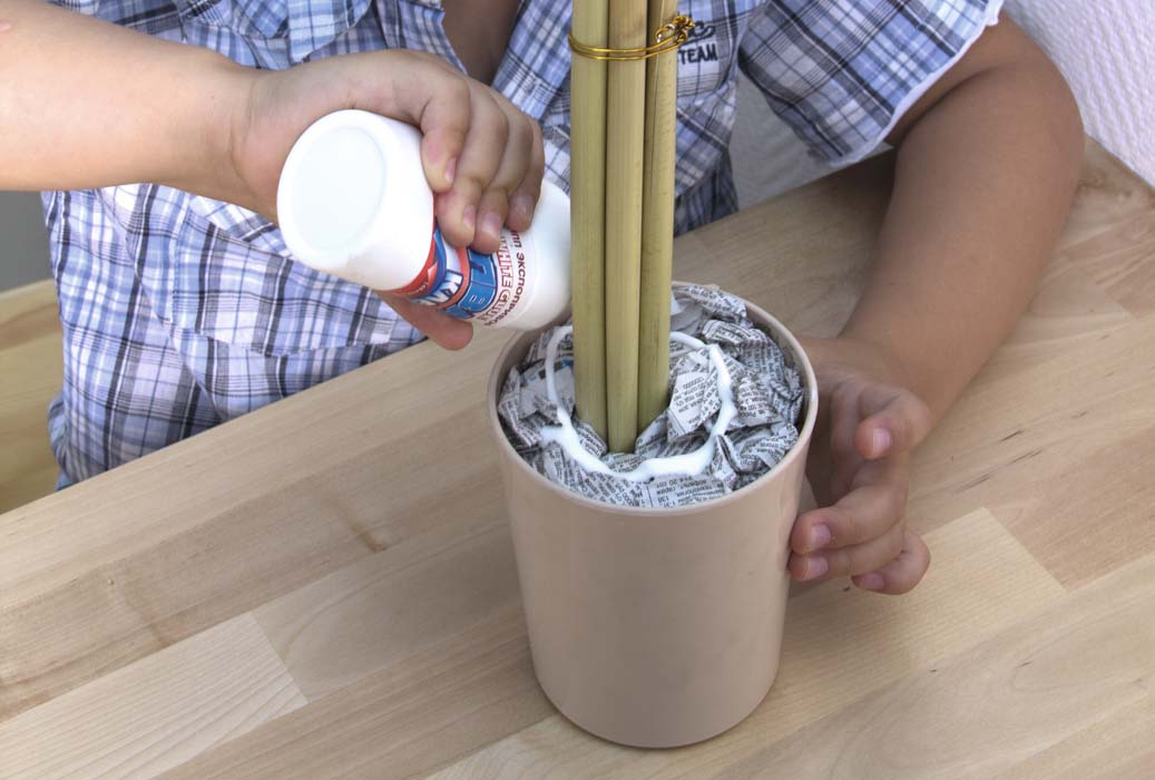 - Разведенной согласно инструкции монтажной смесью наполняют цветочный горшок, не доходя до верха около 3 сантиметров. В центр горшка вставляют ствол будущего дерева и удерживают пару минут для фиксации.