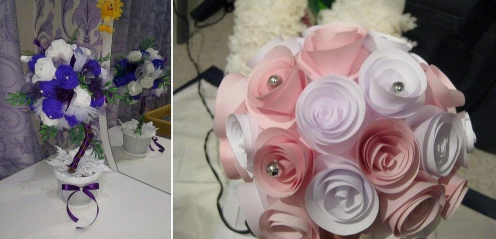 - Цветы – самый очевидный вариант. Цветы могут быть бумажные, тканевые, пластиковые. Их можно купить, а можно сделать самостоятельно. Выбор за вами.