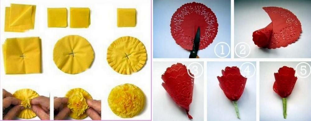 Салфетки складывают в квадраты и фиксируют их посередине степлером. Их края обрезают в форме круга и формируют бутоны, поочерёдно приподнимая и прижимая к центру каждый слой.