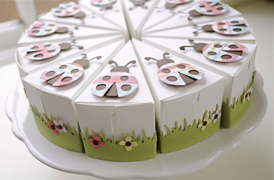 Все остальные действия здесь одинаковы: переводим шаблон на картон, вырезаем, складываем и склеиваем. После чего – наполняем коробочки и украшаем торт.