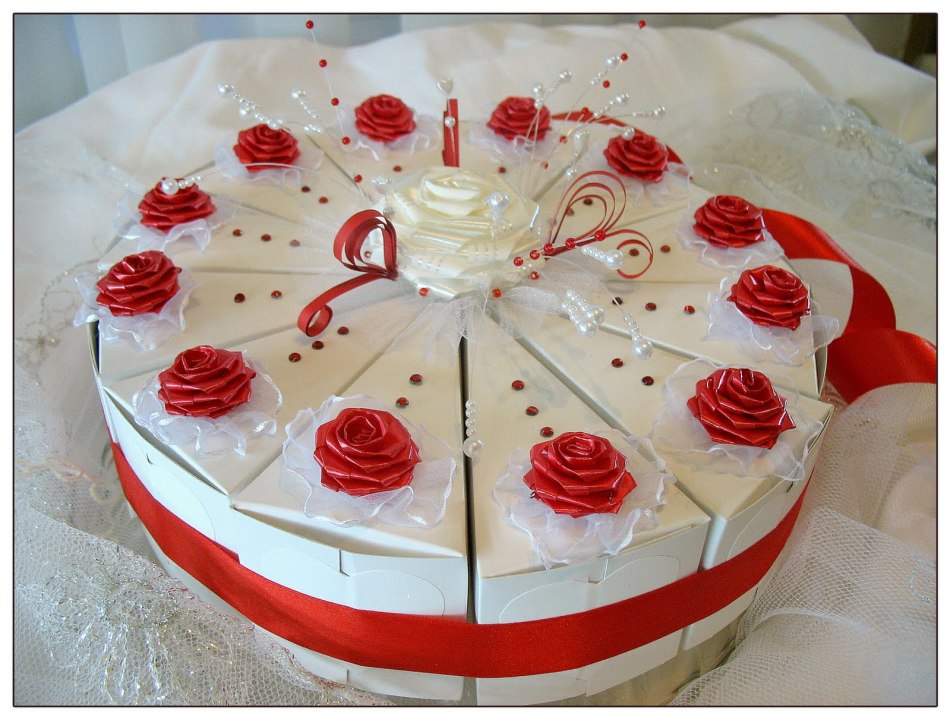- на свадьбу — прекрасный вариант подарить молодым денежную сумму в каждом кусочке, где вы укажете на что желательно ее потратить