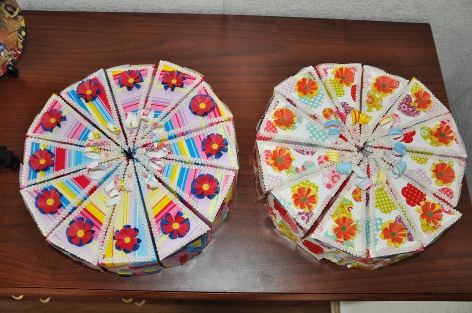 Бумажный торт с пожеланиями состоит из 10-12 отдельных «кусочков»-коробочек, в каждую из которых вкладывают небольшой сувенир и прикрепляют к нему записку с пожеланием.