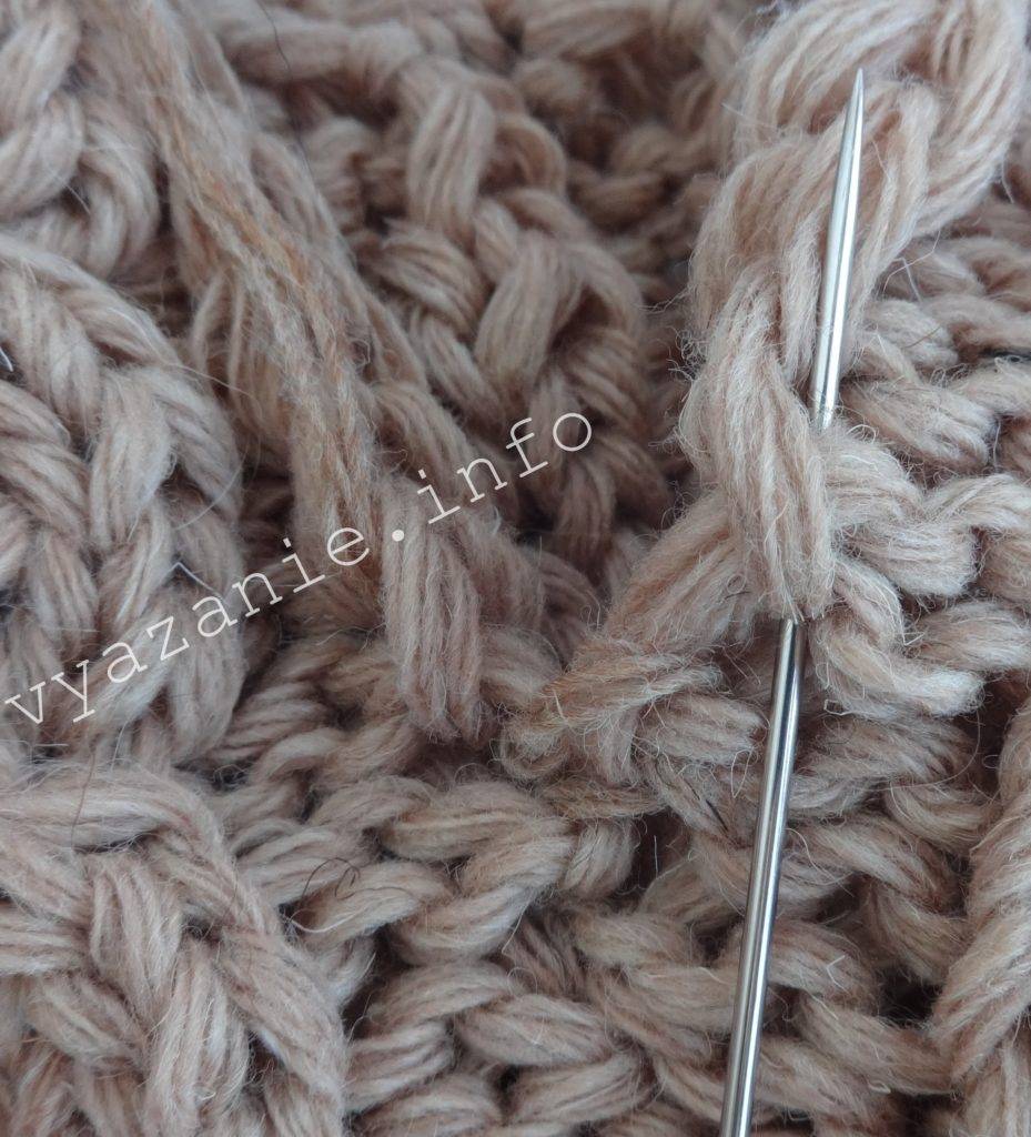 - затем – сверху вниз с лицевой стороны на изнаночную в 1-ю петлю верхнего ряда и сразу же выводят ее снизу вверх в рядом стоящую 2-ю петлю верхнего ряда
