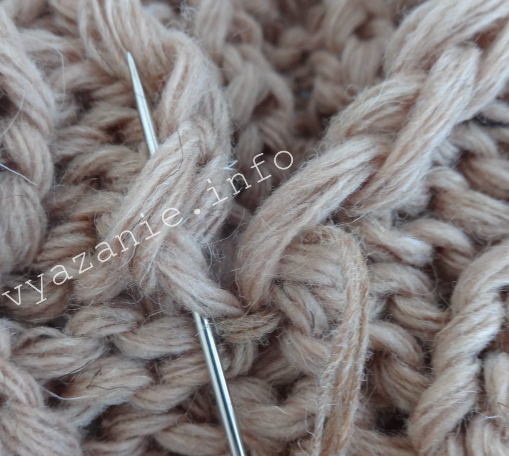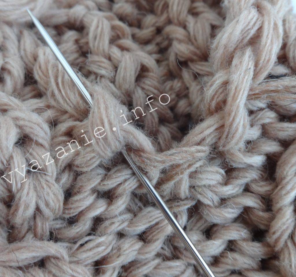 Затем протяните ее с лицевой стороны в первую петлю верхнего ряда и выведите с изнаночной стороны во 2-ю петлю верхнего ряда снизу вверх.