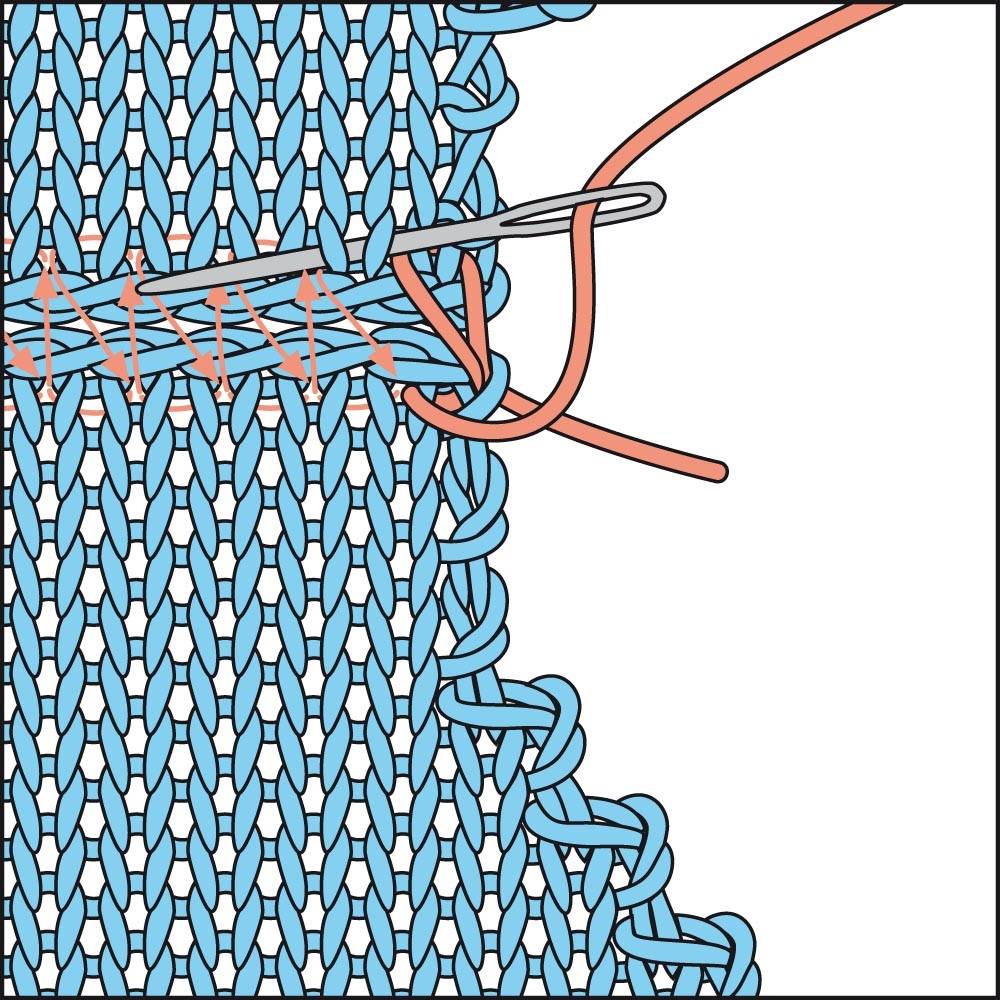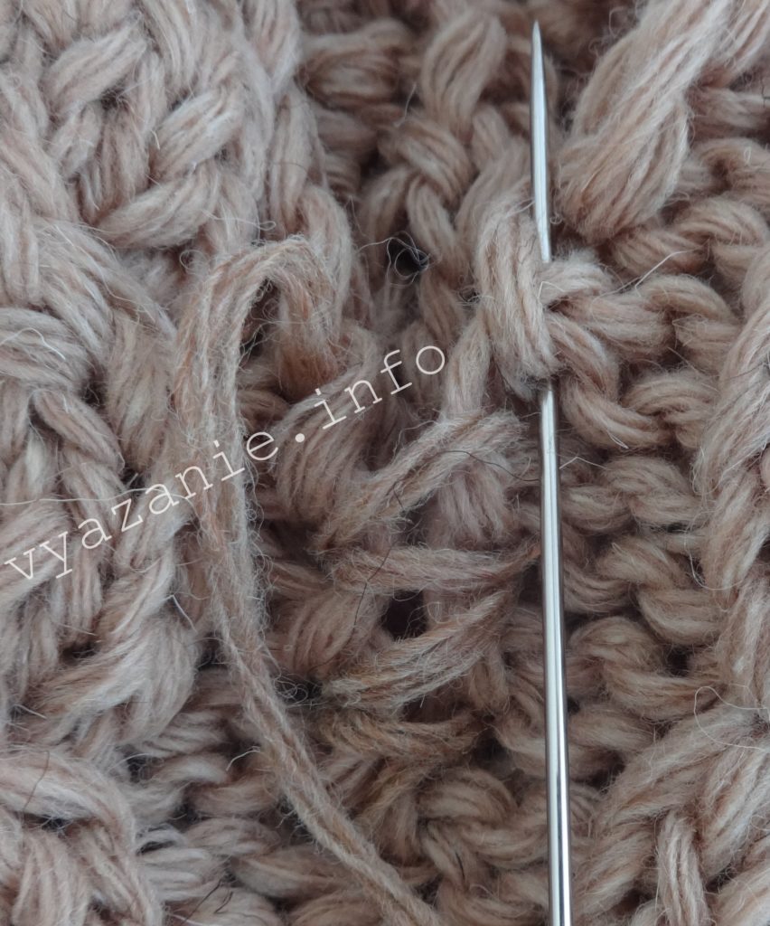 Введите сверху вниз во 2-ю петлю верхнего ряда и протяните снизу вверх из 3-й петли. Остальные петли сшивайте таким же способом. Для того чтобы шов получился незаметным, сшиваемые петли должны быть такого же размера, что и в вязаных деталях.