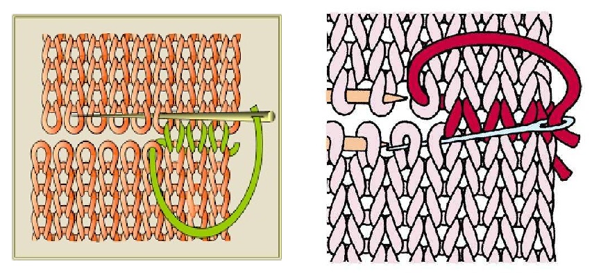 На деталях, связанных изнаночной гладью, петли сшивают, выводя иглу движением не снизу (с изнанки) вверх (на лицевую сторону), а сверху (с лицевой стороны) вниз (на изнанку) и наоборот.
