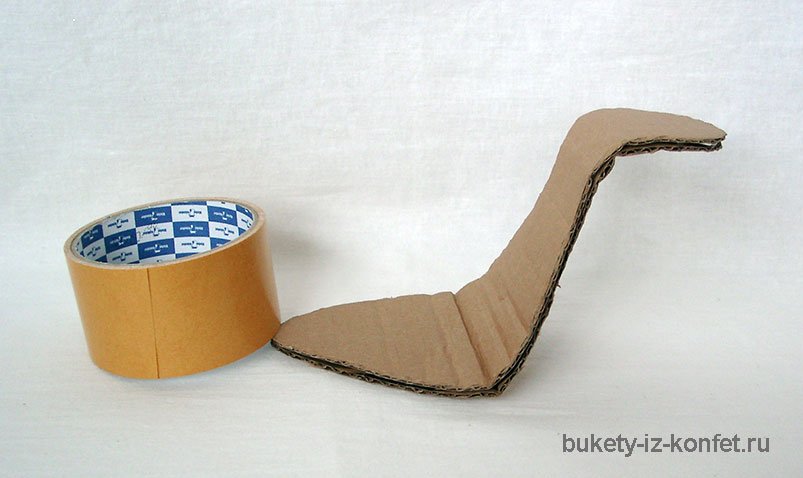 Прикладываем их плотному картону и вырезаем две одинаковые детали. Это будет подошва будущей туфли. На одну из заготовок приклеиваем двусторонний скотч. Затем на него приклеиваем три отрезка проволоки. Сверху по всей поверхности наносим горячий клей и на него приклеиваем вторую картонную заготовку. Все эти действия нужно совершать очень быстро. Когда клей схватился, получившейся заготовке необходимо придать форму как на фото.