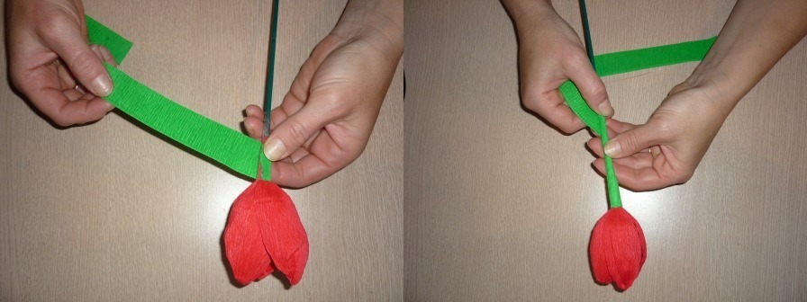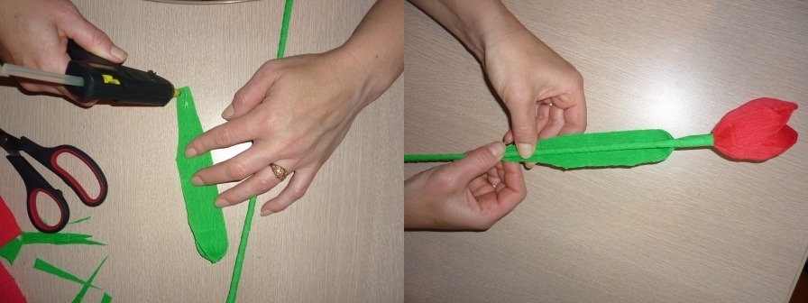 Делаем стебель тюльпана. Нарезаем полоски зеленой бумаги шириной 1-1,5 см. Смазываем клеем чашелистик и обкручиваем его зеленой полоской, далее обкручиваем и стебель тюльпана. В конце обкручивания закрепляем клеем зеленую полоску бумаги.