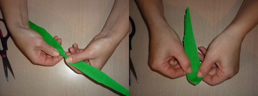 - Вырезаем листочки тюльпана из зеленой гофрирированной бумаги (размер: 10 см х 3-4 см).