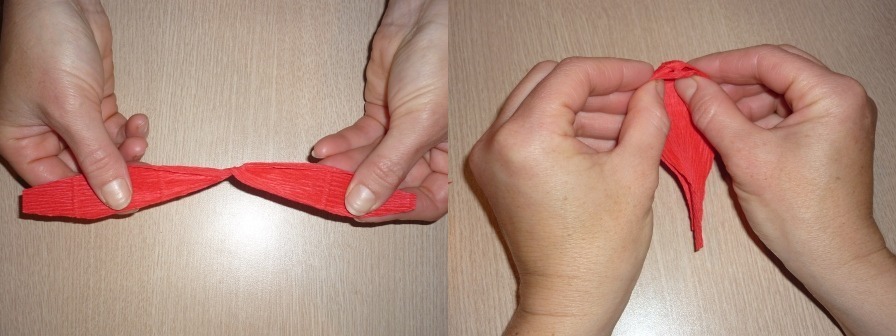 Шаг 2. Согнуть каждую полоску пополам, сжать полоску в центре и перекрутить по центру дважды.