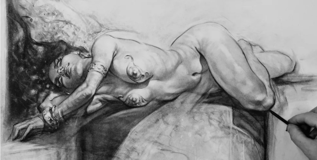 На своем рисунке я решил изобразить жаждущего крови вампира. Большими угольными палочками я рисую абстрактные формы, затем карандашом добавляю нагрудные пластины и украшения. Далее я использую жесткие ластики для выделения бликов.