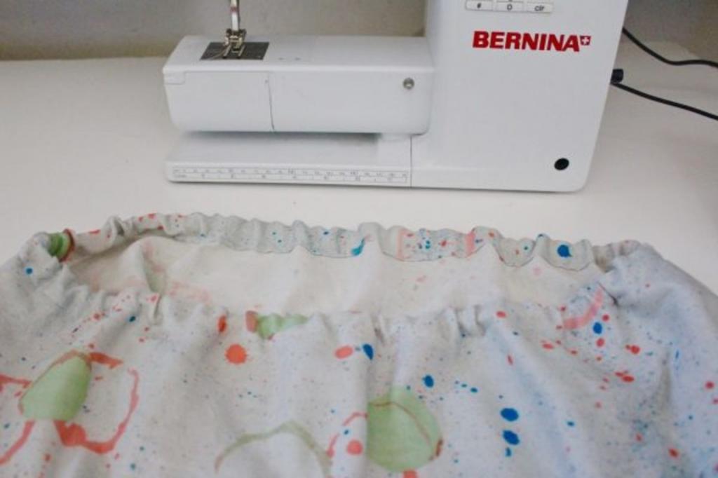- Используем широкую резинку. В этом случае шить наряд начнем с обработки верха. Отрезаем резинку длинной, на два сантиметра меньше обхвата талии (так как резинка при пошиве немного растянется). Раскладываем ткань и, растянув, прикалываем к ней резинку. Теперь прострачиваем на машинке верх, пришивая резинку к ткани. За тем сшиваем бок юбки и обрабатываем низ.