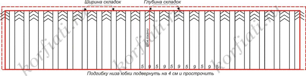 ВАЖНО! Нижний срез юбки подвернуть и настрочить перед тем, как приступить к закладыванию складок. Вычерчивание складок начинать с застроченного шва, который должен уйти в глубину складки