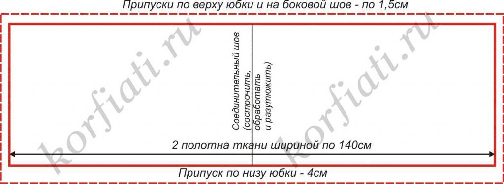 Полотно юбки в складку состоит из двух кусков, каждый шириной 140 см (без учета припусков на швы) и длиной по мерке (длина юбки определяется в зависимости от модели).