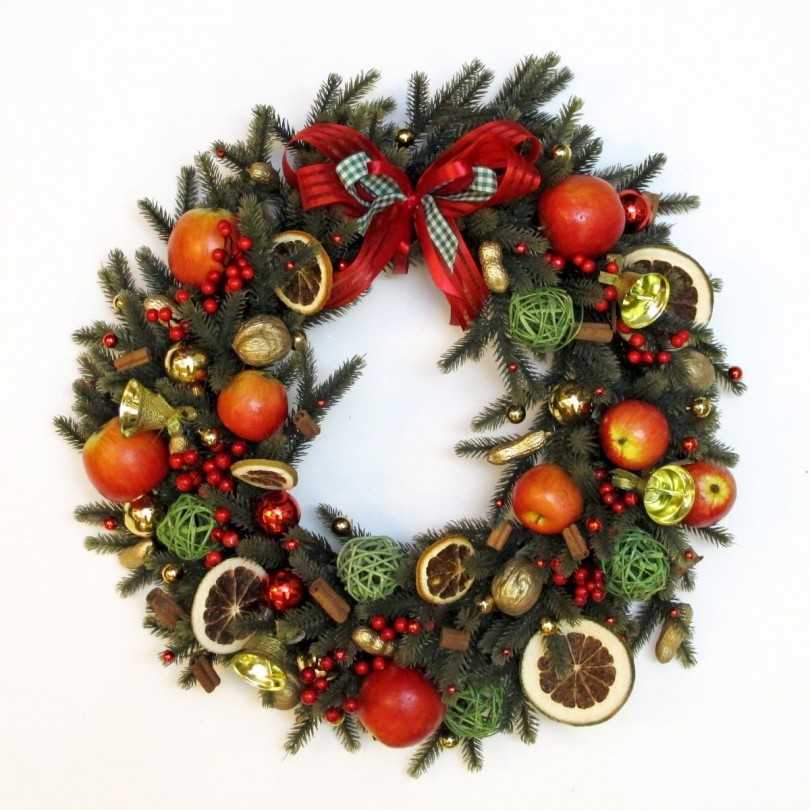 Вот в этой мы видим шишки и другие искусственные фрукты. Оказывается венок сплели из обычной газеты, а после просто спрятали его в органзу и обмотали мишурой.